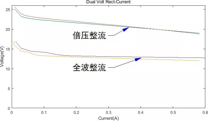 下图显示了倍压整流和全波整流输出电压与电流之间的关系。其中每一种整流方式都使用了单股漆包线和多股纱包线两种线圈做了对比。