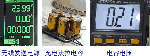 上面实验中,所使用的线圈的匝数为9匝,直径为8.5厘米,高度约0.5厘米。在全波整流的情况下,输出 满负荷电压大约为12V左右。下面做了一个有趣的实验,直接将全波整流输出的电压加在了充电法拉电容(5F)上,直接使用无线充电电源进行充电。居然充电过程非常平稳,在10秒左右将可以将电容的电压充至10V左右。