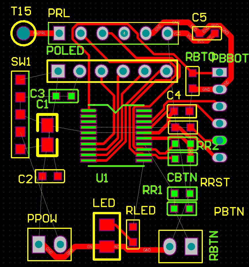 需要通过一个小的单片机,将无线接收模块,液晶显示器简单连起来就可以了。单片机完成无线接收信号的解码,计时显示以及同步清零。简单的一小段程序就可以完成相关的任务。由于功能非常简单,所以绘制的单片机版图也非常小。