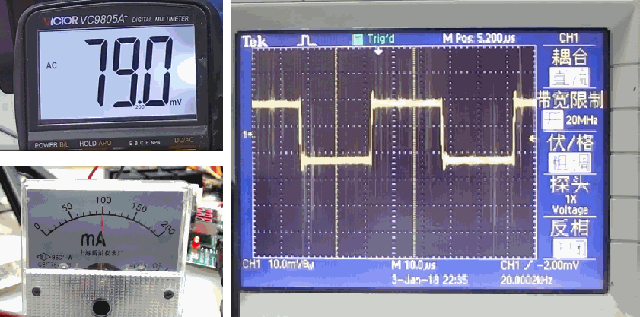 通过下图可以看出,随着电感量增加,输出的电流波形逐步从方波,变成了梯形波。在此过程中,数字交流电压表显示的LC谐振回路电压则始终保持在80mV左右。