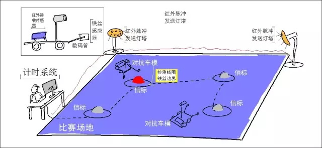 包括在信标感应线圈上同时铺设边界铁丝;赛场周期树立红外脉冲信号灯塔;在车模上增加自动计分电子模块。它带有红外信号接收管、铁丝感应模块以及数码管等。整个系统在中央计时系统控制器完成车模各自计分。