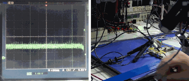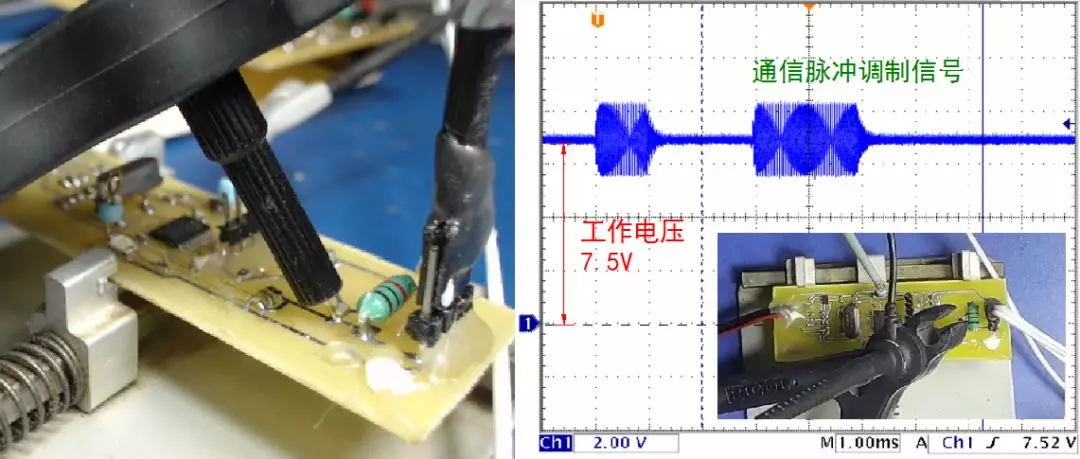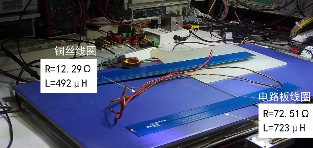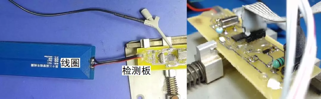 下图显示了调试中的线圈和检测板。在实际系统中,线圈和检测板将会制作成一个整体电路板。