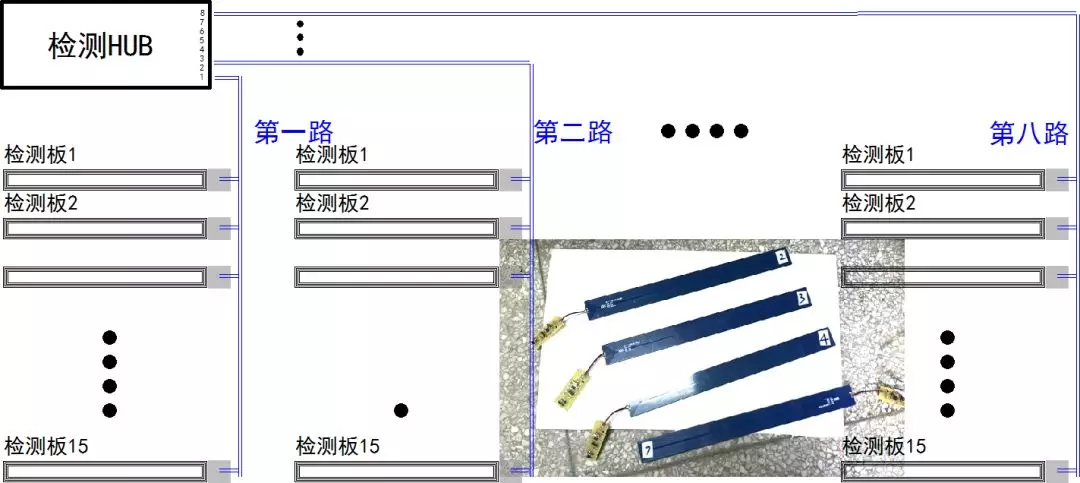 为了提高通讯速度以及通讯的可靠性,就需要多条通讯总线并行进行通信。下图显示了实际自动比赛系统的总线结构。比赛系统包括一个集线器,它具有八条外接总结接口。每一条总线上可以最多挂接15个检测板。整个系统最多可以有120个检测板。