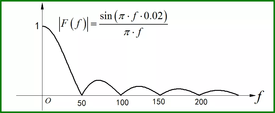 理论上讲,这些交变信号可以通过低通滤波器进行滤除。但是车模通过检测线圈时,如果速度很快,所产生的感应电动势的频率也会达到很高。比如,当车模速度为2米/秒通过检测线圈时,检测线圈的有效宽度为2厘米,此时所产生的信号时间长度为 0.02/2=0.01秒。下图显示了一个宽度为0.01s的升余弦脉冲信号的频谱图,可以看到它的频率已经扩展到了100Hz的范围。