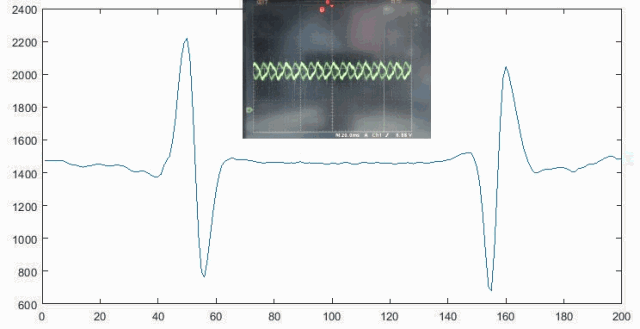 下图中显示了线圈信号经过放大之后的波形。可以看到信号中的50Hz干扰彻底消失了,只剩下非常干净的感应电动势信号。这就会大大降低误检测的概率。