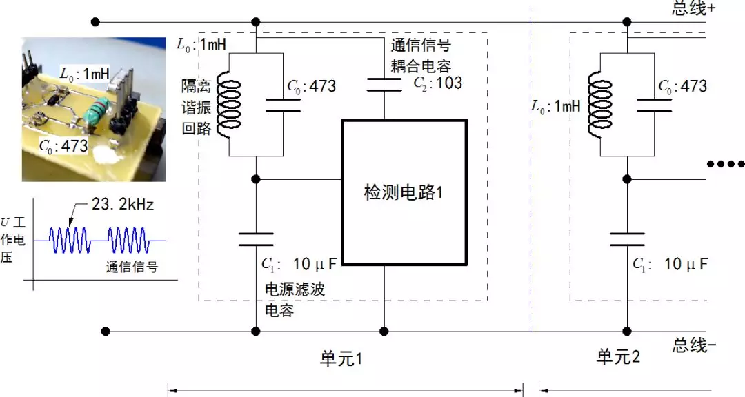 为了减小总线的信号个数,方便布线,比赛系统采用电源线通信的方式,将总线中的线的个数减小到两根。由于电源为直流信号,通信信号为交流信号,所以通过简单的谐振电路便可以将同一根电源线中的两个信号进行分割。