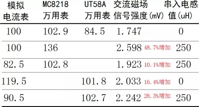 如果外部串入250uH的电感,此时如果维持模拟电流表、MC8218、UT58A显示在100mA左右不变,此时外部的交流磁场强度分别增加了48.7%, 10.1%, 28.3%。