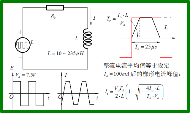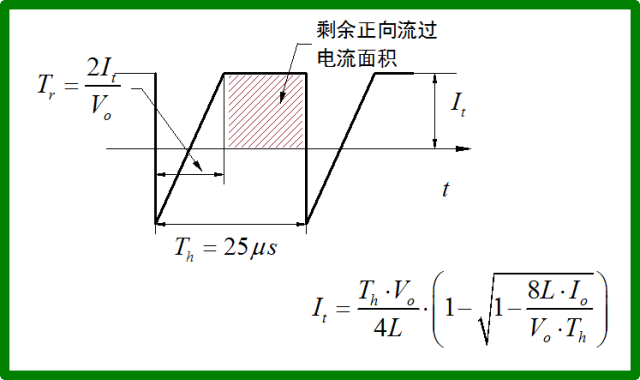 考虑到负向电流的作用,计算正向流过电流的时候,只剩下当电流到达横流值之后的电流值。因此,在保证流过电流平均值维持在I0不变的情况下,电流的峰值 It 计算模型 如下面图中的公式所示。这里省略了具体的推导过程。