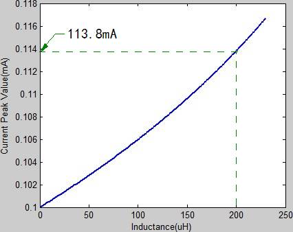 其中分析过程中,假设线路中的串联电阻R0可以忽略不计。根据上图中的公式,电磁线的电感从10变化到230uH,在维持电流整流后的平均电流仍然保持100mA的情况下,输出电流峰值变化如下: