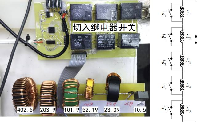 为了方便获得不同电感值下的输出信号的强度,实验中使用了六只不同的电感通过相互的串联可以获得不通电感值。选择电感值为比值为2的等比序列。因此可以通过不同组合的串联获得64个不同的电感值。