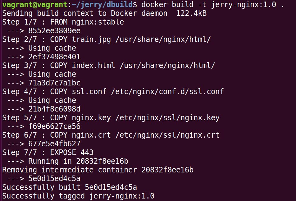 最后一行日志提示标签为jerry-nginx:1.0的景象被成功构建。
