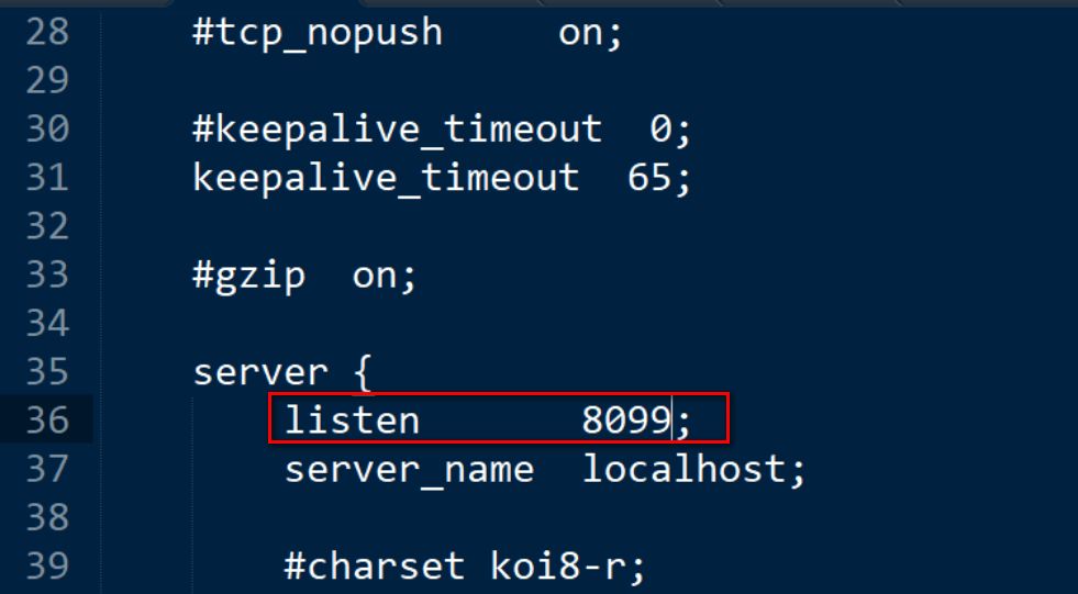 进入conf目录下,修改nginx.conf文件,把server对象里的字段listen的值从80修改到8099: