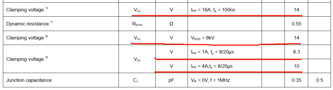 如下是一个TVS的钳位电压数据,有4个值,选型时,该看哪一个呢?