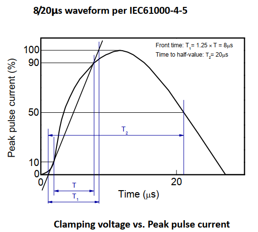 下面两个Vc=8.3V和10V,测试的标准是IEC 61000-4-5,指定的浪涌波形是8/20us,指8us达到100%Ipp,20us后达到50%Ipp,所以看到,反向峰值电流Ipp为4A时的钳位电压是要比1A时的大的。