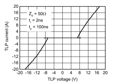 需要注意,TLP曲线中的“钳位电压”为瞬态100ns测试给出的,和真正我们理解的,持续工作不会损坏的钳位电压还是有差别的。