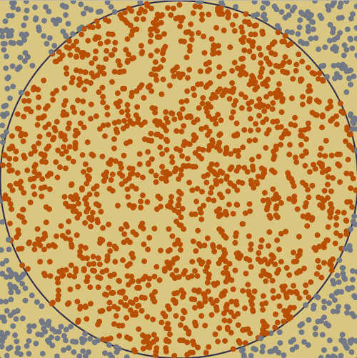 如果这些点均匀分布,那么圆内的点应该占到所有点的 π/4,因此将这个比值乘以4,就是π的值。通过R语言脚本随机模拟30000个点,π的估算值与真实值相差0.07%。