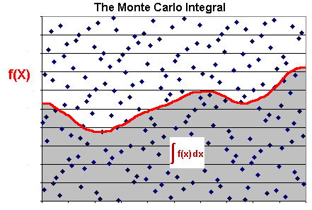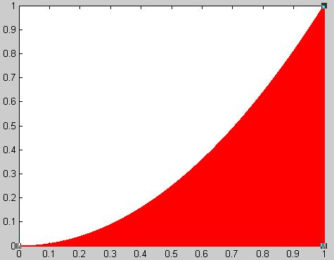 这个函数在 (1,1) 点的取值为1,所以整个红色区域在一个面积为1的正方形里面。在该正方形内部,产生大量随机点,可以计算出有多少点落在红色区域(判断条件 y < x2)。这个比重就是所要求的积分值。