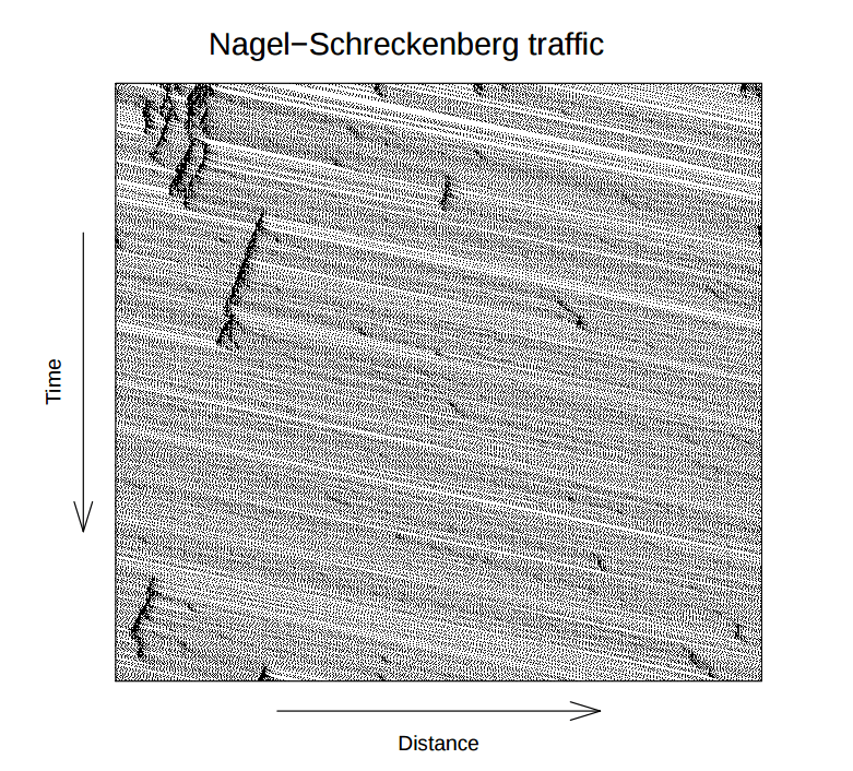 可以看到,该模型会随机产生交通拥堵(图形上黑色聚集的部分)。这就证明了,单车道即使没有任何原因,也会产生交通堵塞。