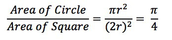 正方形内部有一个相切的圆,它们的面积之比是π/4。