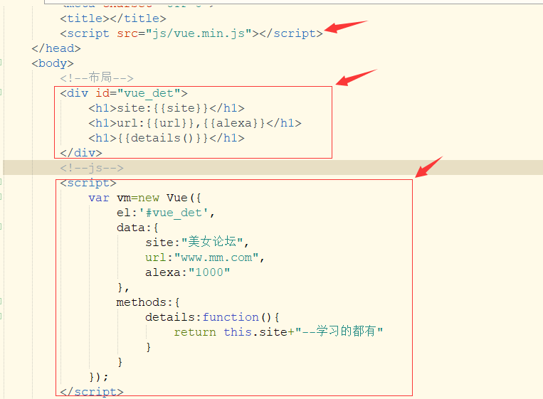 3.js代码,都需要new Vue()的实例。其中,el:表示DOM中的Id,本处为vue_det,表示我们针对这个div进行操作;