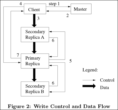 (2)控制流从客户机到主Chunk、然后再到所有二级副本。
