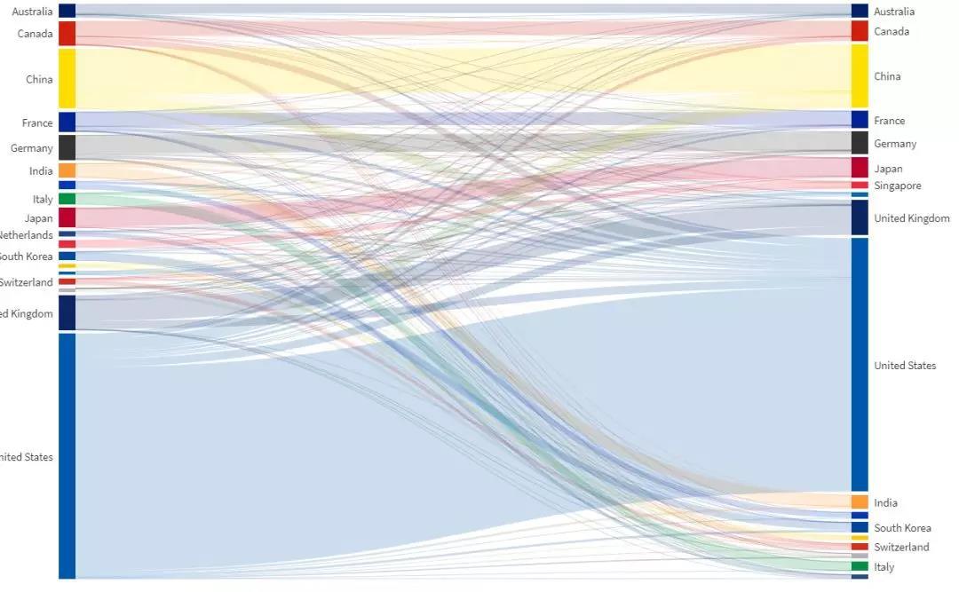 中国和美国之间的AI交流特别活跃,双方彼此的人才流入流出总体上保持平衡:在22400名研究人员中,大约500名专家在中国获得博士学位,然后去为美国的雇主工作,也有500多人在美国获得博士学位,然后去为中国雇主工作。在美国和英国之间也存在类似现象。