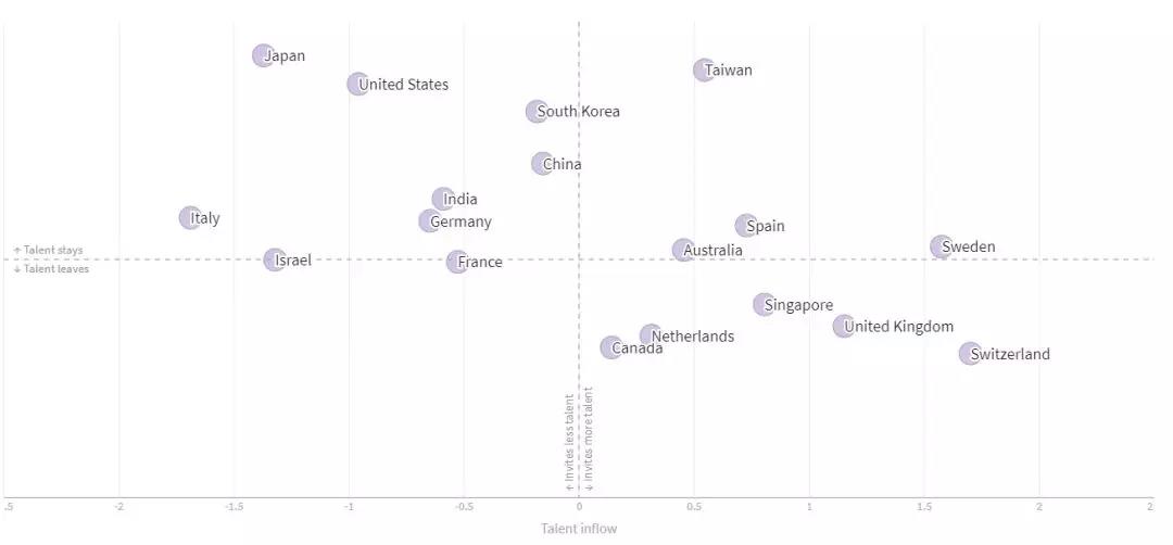 “AI人才吸引国”:位于图中右上角的是澳大利亚、西班牙、瑞典和中国台湾地区,该区域表示这些国家的AI人才呈净流入趋势,说明这些国家或地区在吸引外来人才和留住本国(或本地区)的AI人才上方面都具有优势。