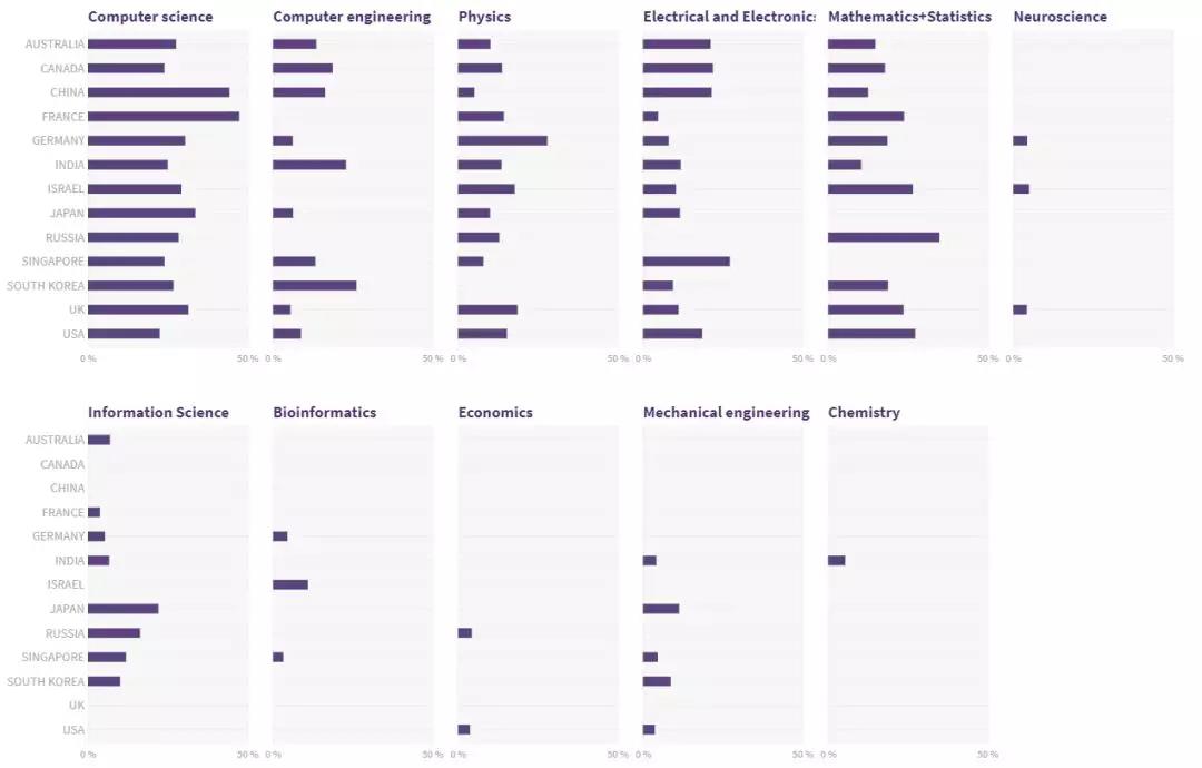 数据表明,这些自称AI专家的人接受过各种学科知识的训练。有28%的人将计算机科学列为自己相关学科领域。在一些国家,这一比例尤其较高,包括法国(47%)和中国(44%)。