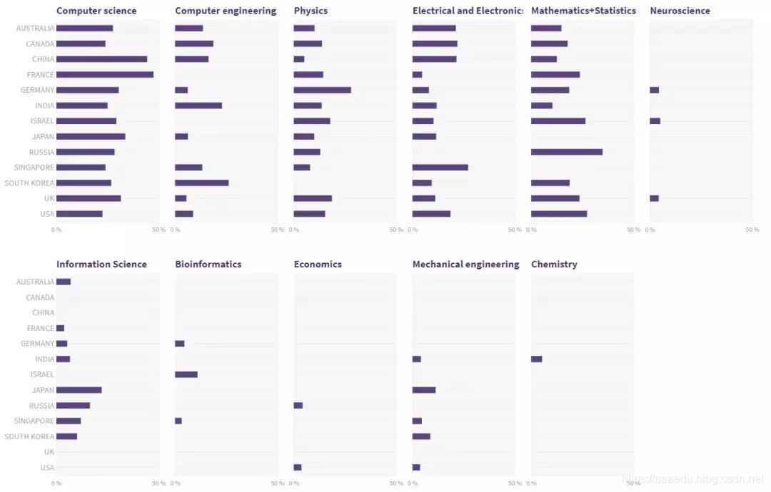 同样,另一些国家的AI人才中,将其他学科作为相关领域的比例较高,比如物理学:总体而言,9%的AI人才表示自己接受过物理学训练,但在德国,这个比例高达28%。对于数学和统计学,总体比例为18%,但在以色列和美国的比例为27%,在俄罗斯更高达35%。