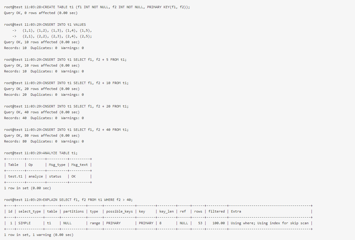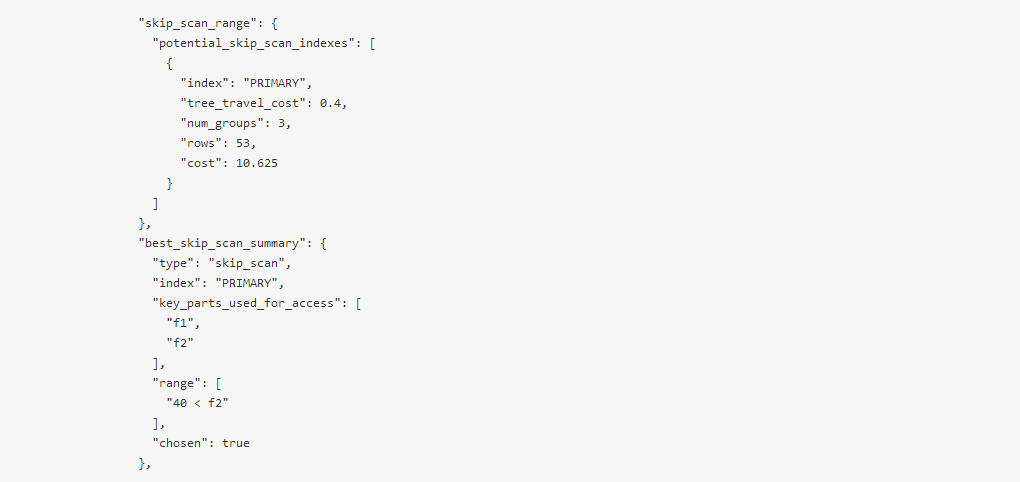 当skip scan拥有更低的cost时,会被选择,计算cost的函数是cost_skip_scan(),由于索引统计信息中已经基于不同的前缀列值估算了distinct value的个数(rec_per_key), 可以基于此去预估可能需要读的行数。 更具体的可以参考wl#11322中的描述,笔者对此不甚了解,故不做笔墨ref: cost_skip_scan()