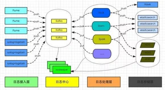 通过 Flume 或者 Logstash 上传到日志中心(Kafka 集群),然后供 Track、Storm、Spark 及其他系统实时分析处理日志。