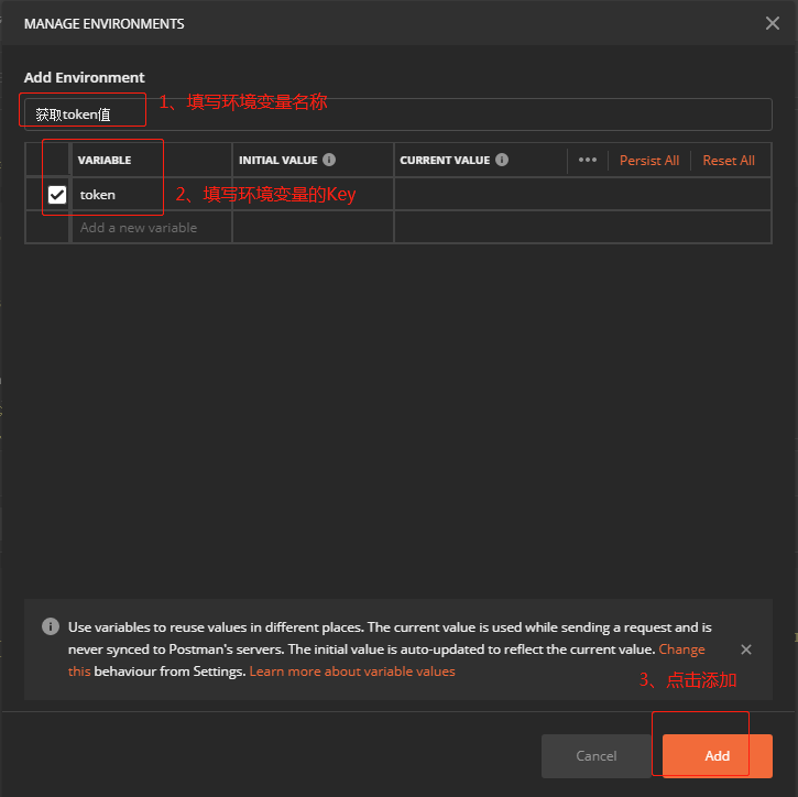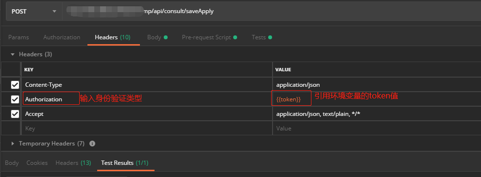 3、在业务接口请求的Headers中引用环境变量的名称。