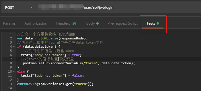 2.1、打开登录接口,点击Tests菜单。输入代码