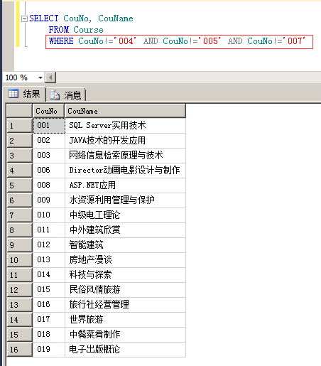 课堂练习:查询课程编号在004与007之间的课程,包含课程编号和课程名称,字段名显示为中文。