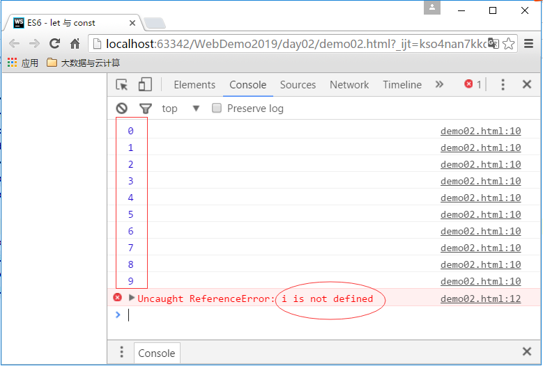 如果不用let而用var来定义循环变量i,结果将会如下所示: