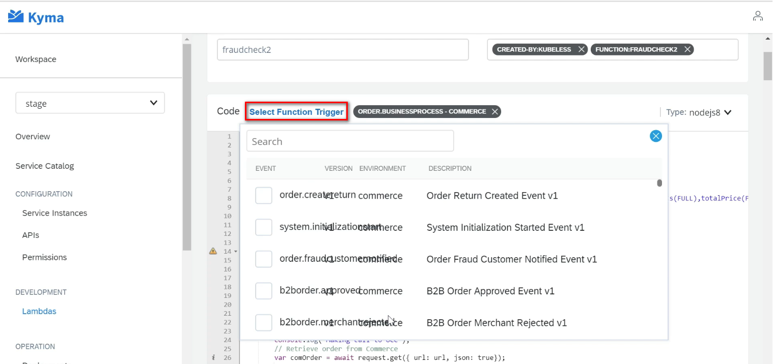 2. 事件注册好之后,使用微服务架构实现事件的监听者(消费者)。这也是Kyma官网里提到的"开发者可以使用任何技术栈进行扩展开发“的含义。举个例子,我们在SAP Commerce Cloud里创建一个订单后,客户提出了基于该企业流程的一些特殊校验逻辑。Commerce Cloud发布一个"Order Create"的事件,事件payload包含创建订单的字段。我们开发并部署在Kyma上的微服务监听这个事件,微服务内部实现可以采取任何技术栈,Commerce Cloud通过HTTP调用包含了企业自定义订单校验逻辑的微服务,根据其返回的校验结果进行后续处理。