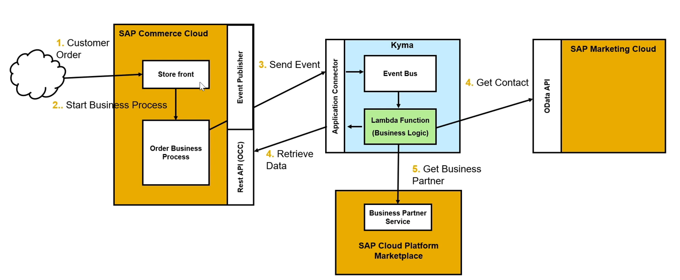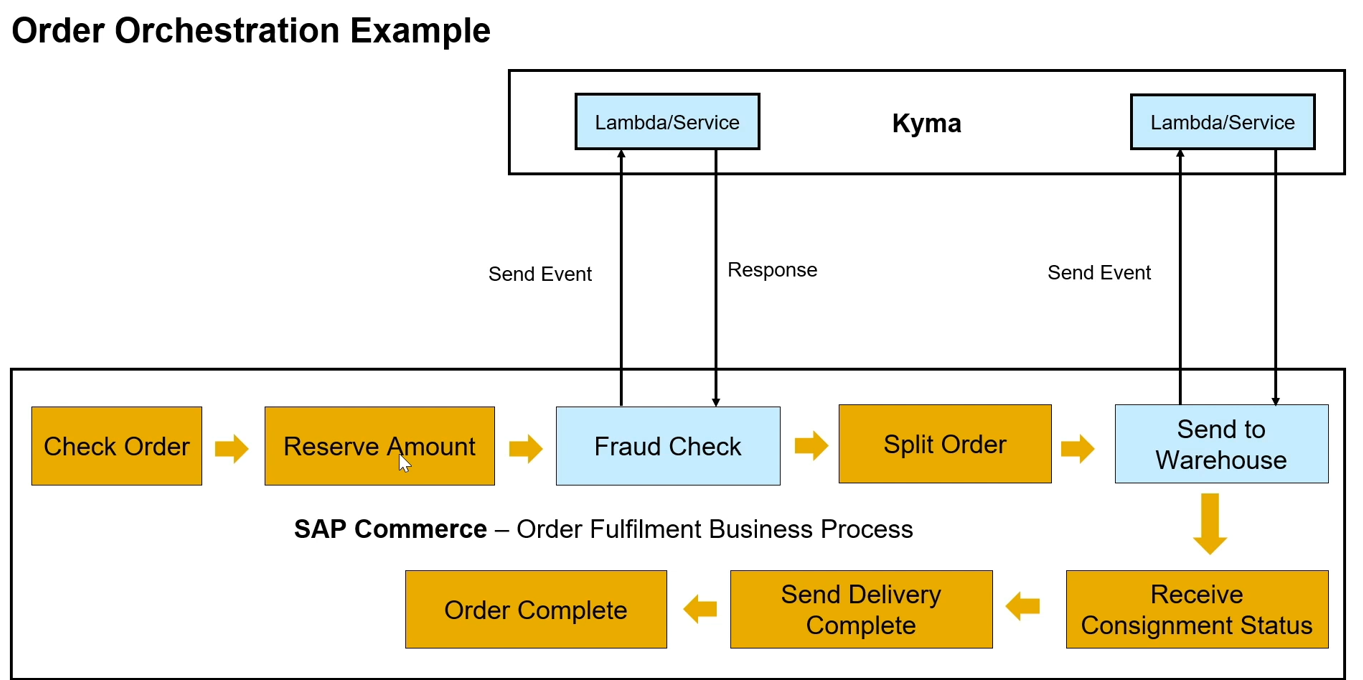 下图蓝色流程是我们通过Kyma对Commerce Cloud的标准流程进行的增强,主要是在下单过程中增加了一些Validation校验。