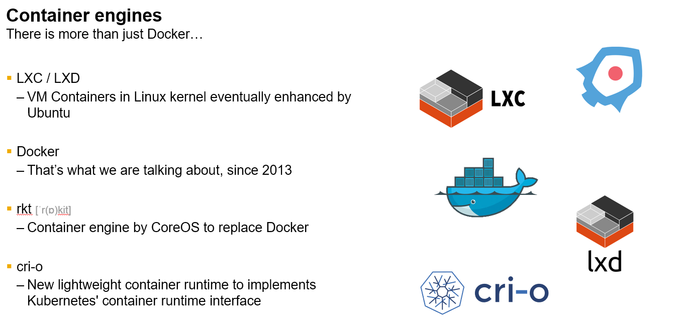 要注意,容器 != Docker。Docker只是容器技术的一种商业化实现方案。