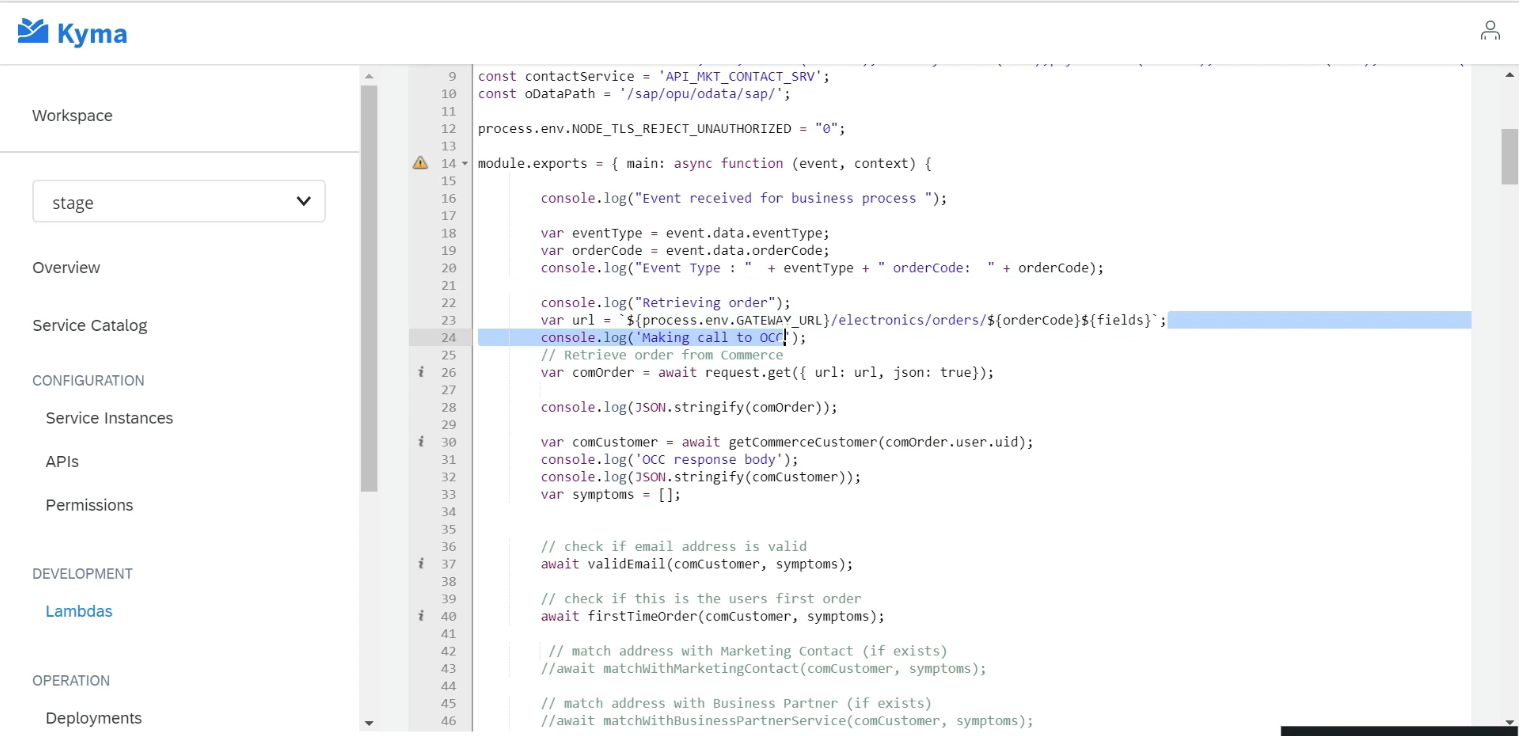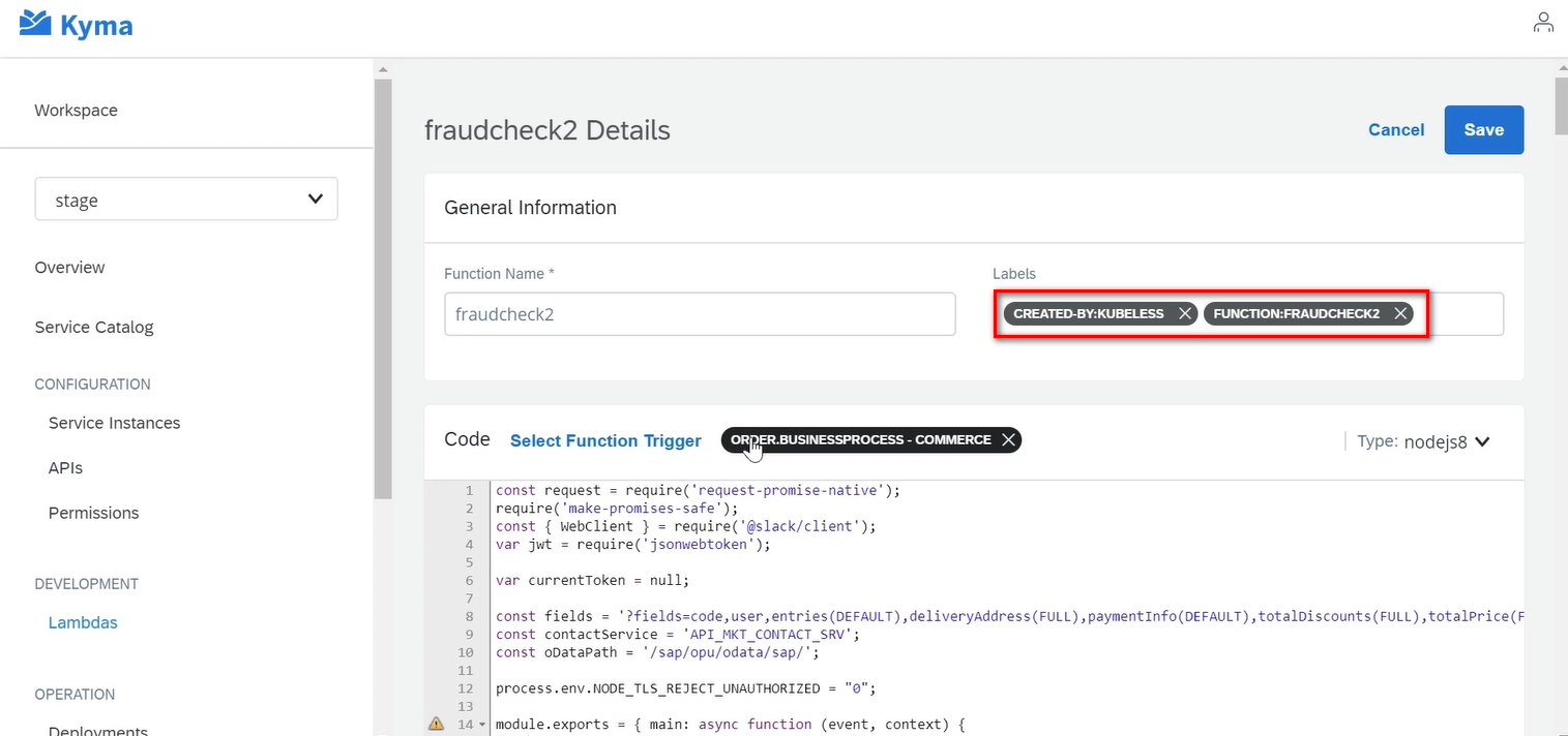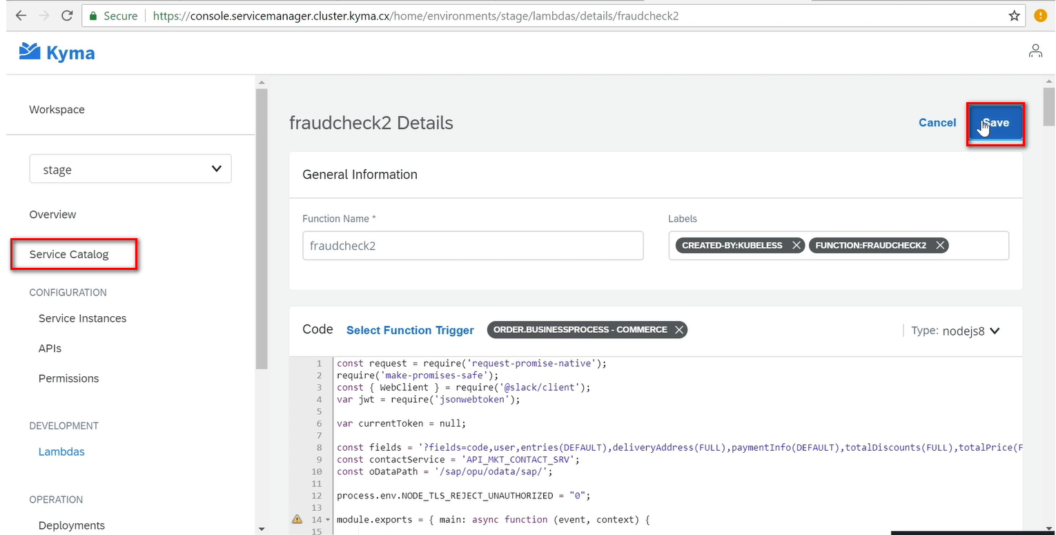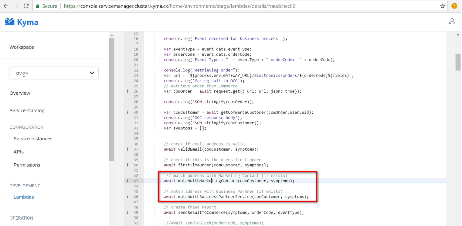 现在再回到Kyma的Lambda函数编辑器里,将之前注释掉的从Marketing Cloud获取联系人地址的函数以及调用SAP云平台的Business Partner服务的函数重新启用: