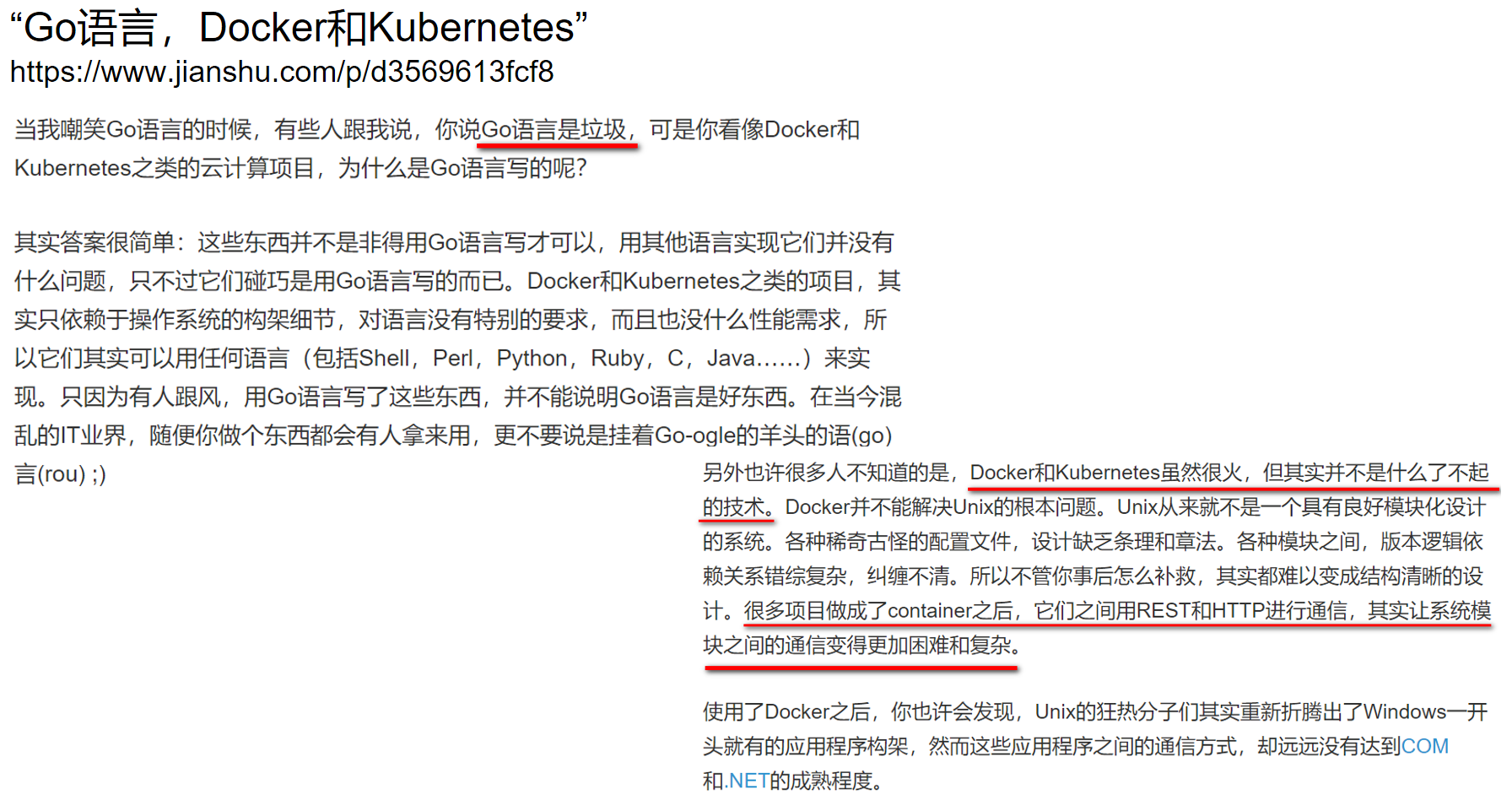 著名的计算机科学家王垠,曾经在他的个人博客上撰文,声称Docker和Kubernetes并不是什么了不起的技术。从科学家的角度出发,这个论断不能算错误,因为Docker底层确实就是对Linux里很多原语做了很好的封装,所以从商业化的角度取得了成功。