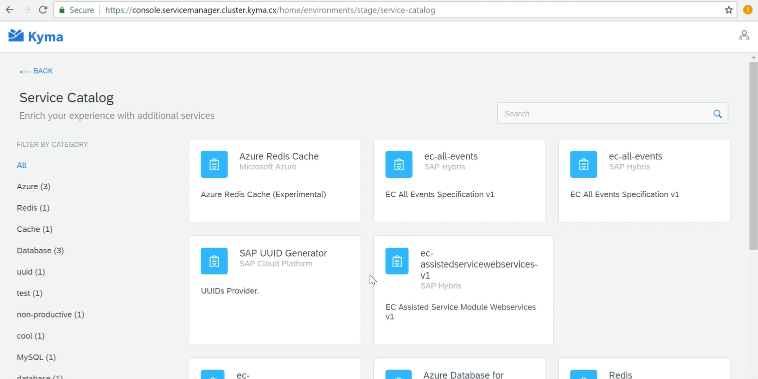 启用之后,保存,然后进入Service Catalog。这个组件也是Kubernetes提供的标准组件,Kyma基于它做了增强,能够将第三方的服务导入进来给Kyma的Lambda函数消费。
