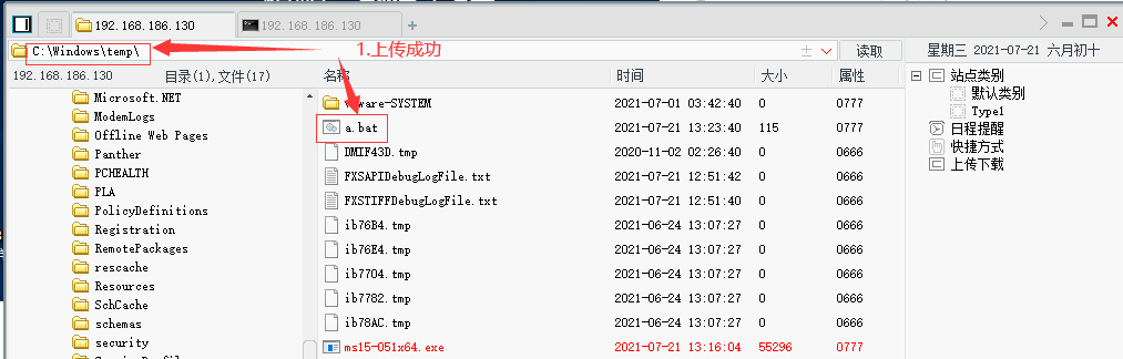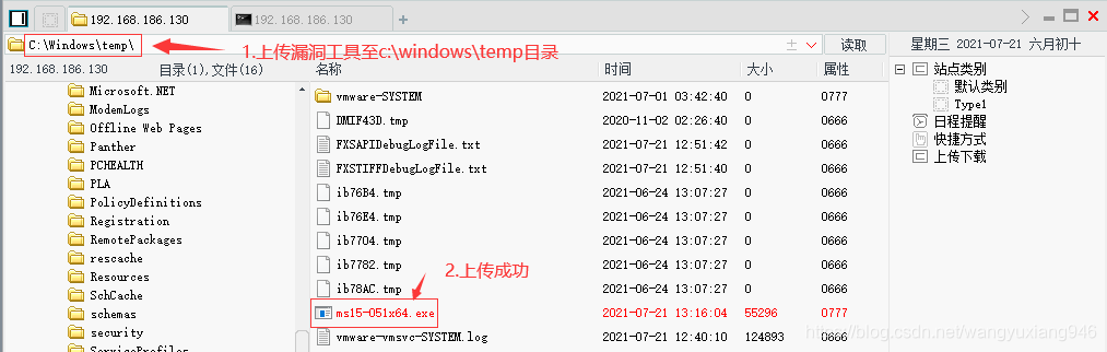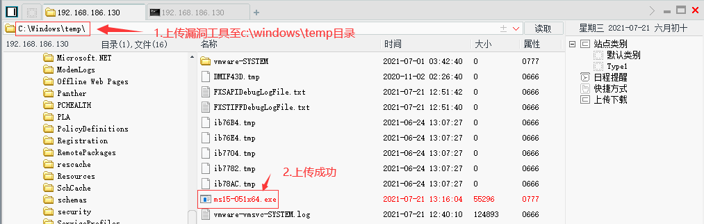 Windows系统的回收站和c:\windows\Temp目录默认具有上传和执行权限,所以我们将漏洞工具上传至c:\windows\Temp目录下