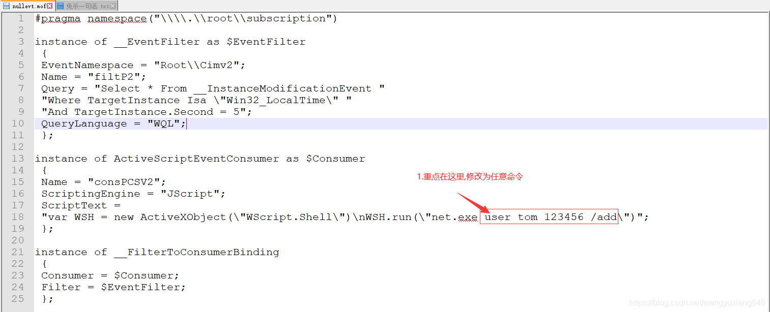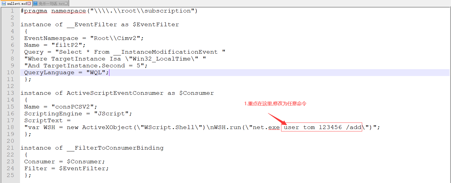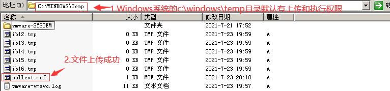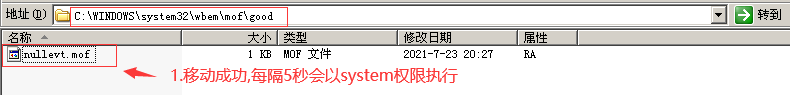 mof是Windows系统的一个文件(在c:/Windows/system32/wbem/mof/nullevt.mof),用来监控进程的创建和死亡,每隔5秒就会以system权限执行一次,攻击者将构造好的mof文件上传到指定目录下,就能执行任意命令