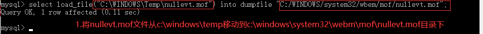 使用MySQL的文件读写功能将nullevt.mof文件从C:\WINDOWS\Temp目录移动到C:\WINDOWS\system32\wbem\mof目录下