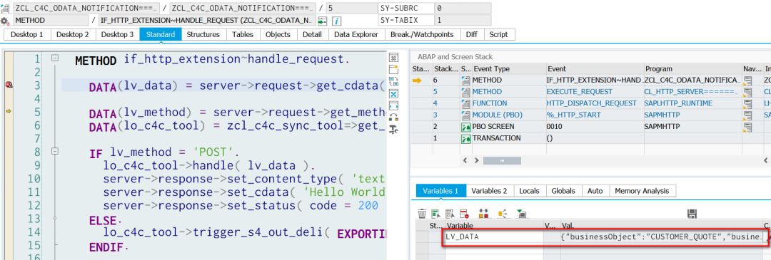 从调试器里可以看到,S/4HANA接收到的是一个JSON格式的字符串,包含了触发事件的BO名称,发生状态变化的BO实例的GUID,触发的事件类型以及一个OData服务的url。这个OData服务正是我在第一步创建的zjerrysalesorder。