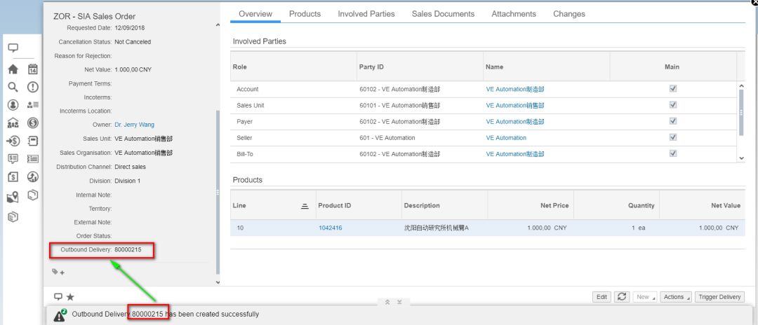 点了按钮在S/4HANA生成交货单之后,其ID通过S/4HANA Restful API的返回结果存储在C4C销售订单BO的扩展字段上,并显示在UI抬头区域: