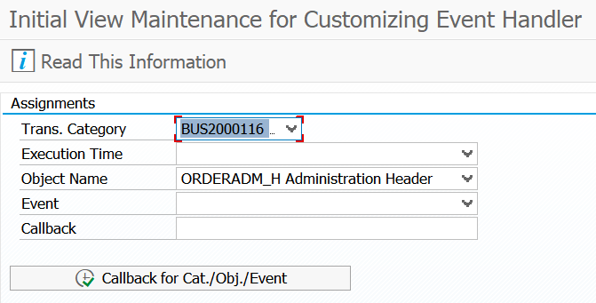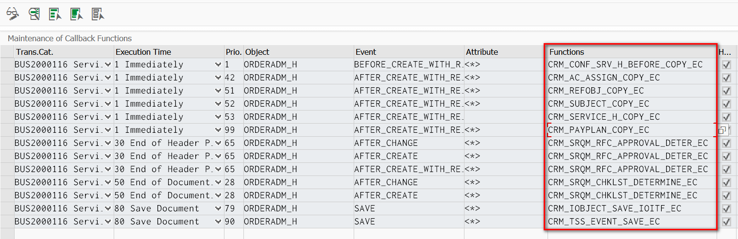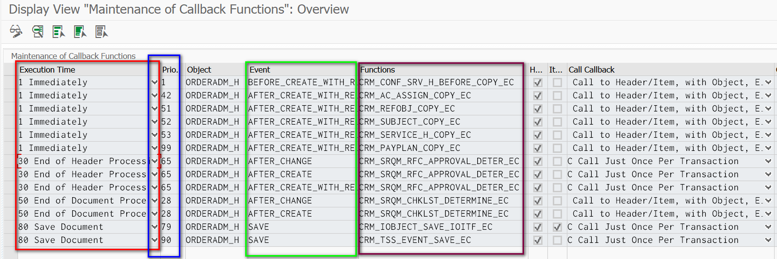 下图第一列红色的Execution Time,表示这些分配的函数到底是事件触发后立即执行,还是延迟到订单抬头或者行项目的通用例程执行完后再执行(往往用于实现批量操作,或者待执行函数同通用例程存在依赖关系,或者出于性能考虑)。