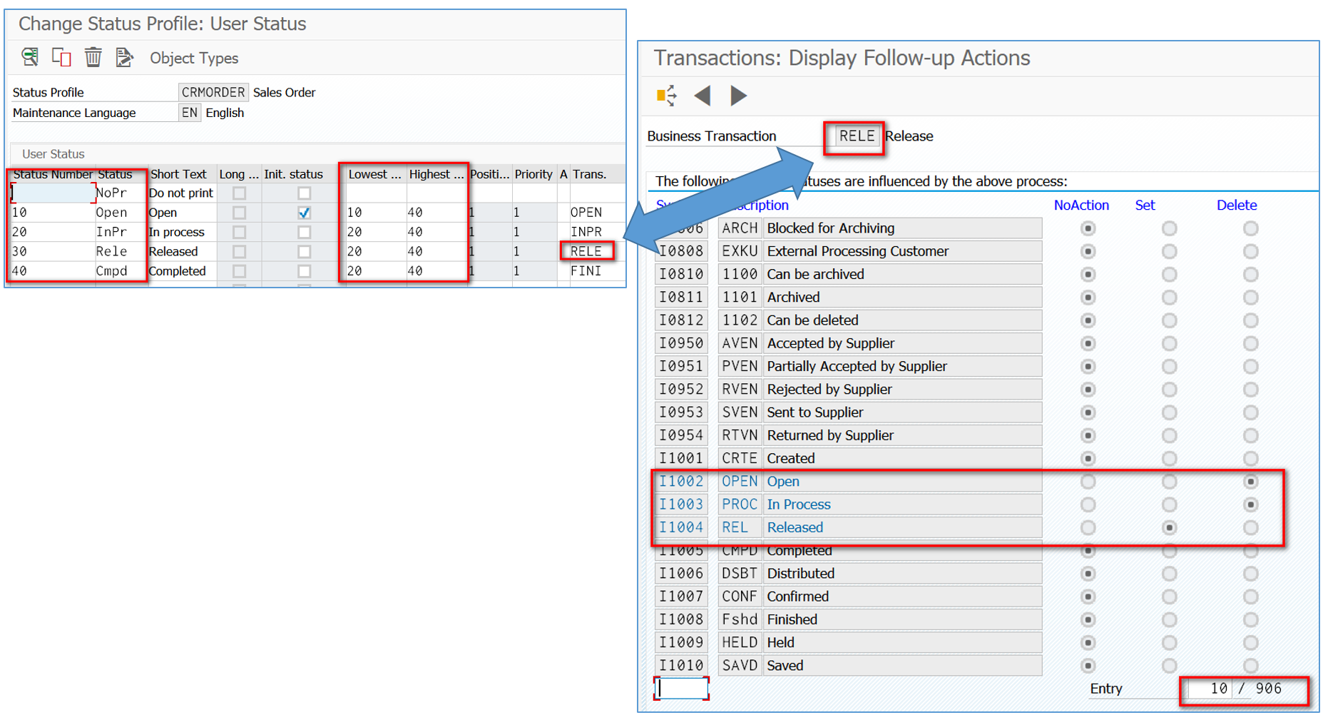 下图左边的Open, In process, Released和Completed就是用户自定义订单状态,SAP允许客户给每个状态分配一个Low和High的值,通过这种方式巧妙地提供了一种用非图形化方式进行状态跳转的定义。