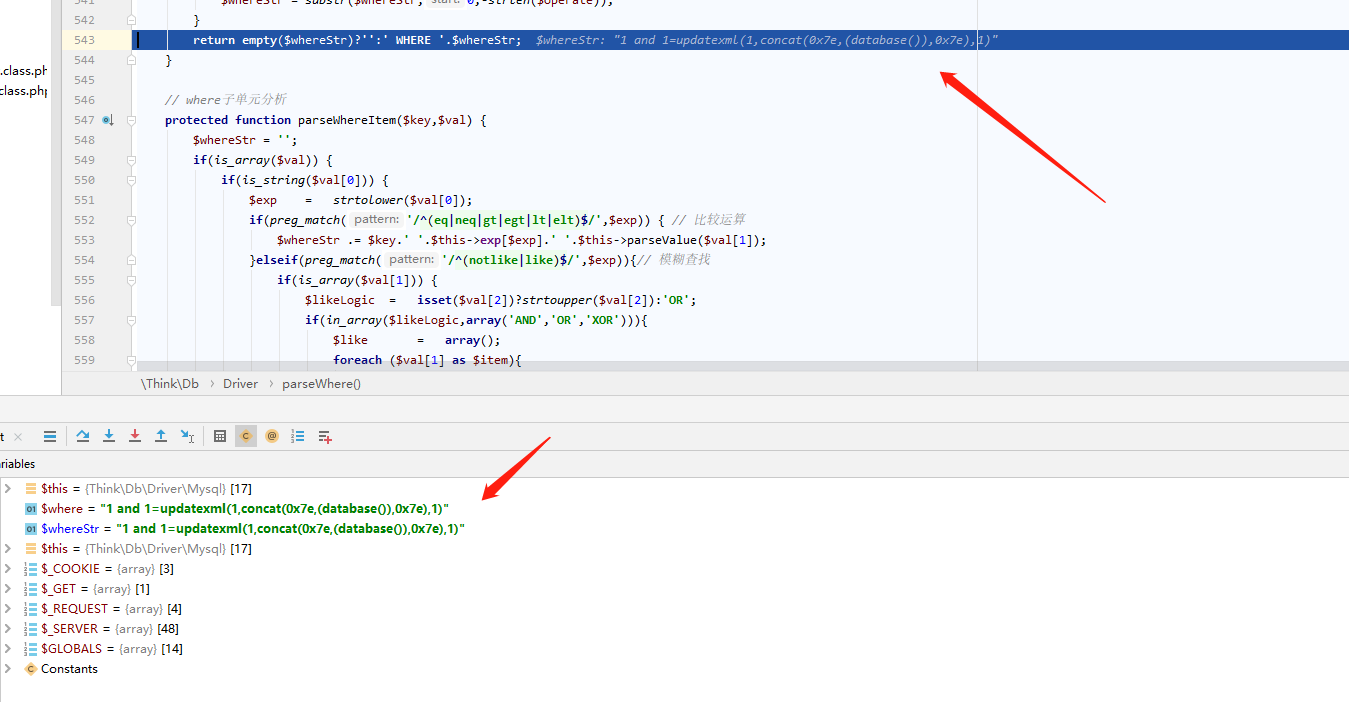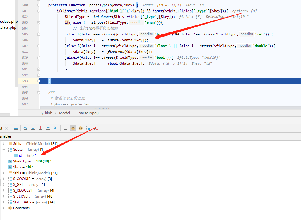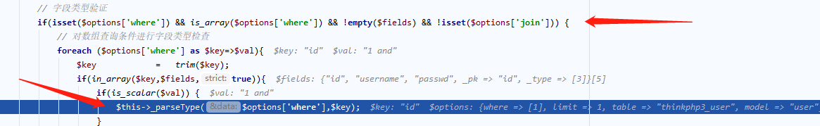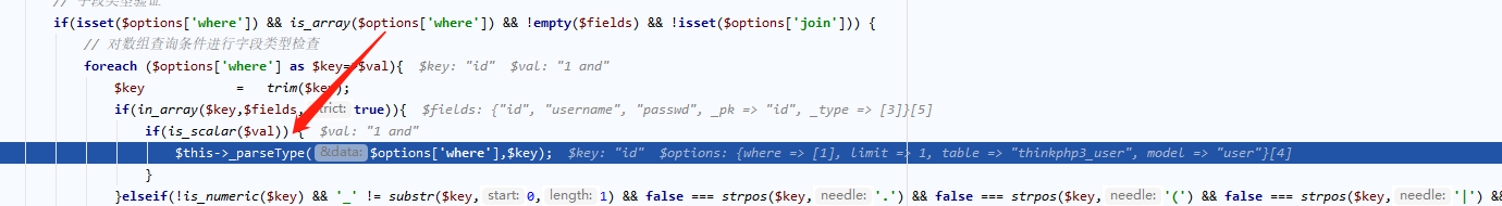 由此可见,我们不进入parseType函数就可以不会被强转即我们不满足第一个条件(is_array$options[‘where’])即可