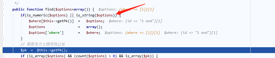 如果传入的是id,那么$options就会变成一个二维数组,$options[where][id]才是字符串,$options[where]是一个数组